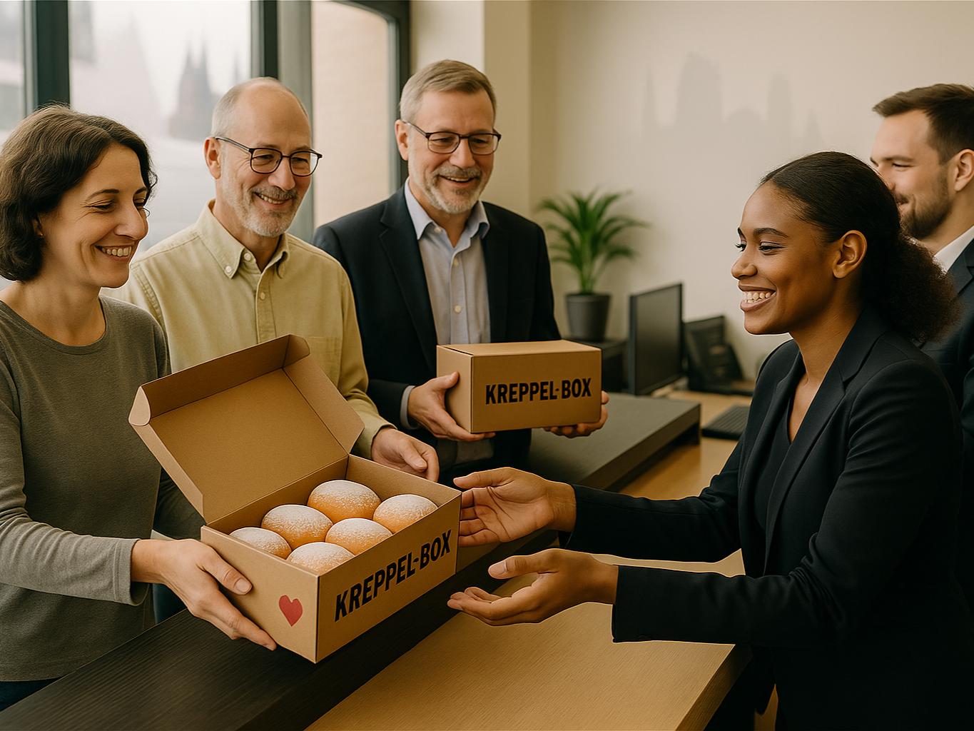 Wir verkaufen Kreppel in Boxen an Unternehmen oder Einrichtungen, die Ihren Mitarbeitenden eine Freude machen wollen.